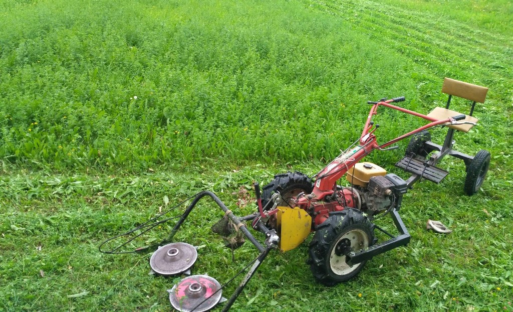 Чтобы полученную конструкцию установить на мотоблок, проверьте, чтобы на лезвиях был установлен защитный кожух, снимите с колес грузы, если таковые имеются. Скашивайте траву, используя бензиновые сенокосилки, на небольших оборотах, включив муфту сцепления, не делая резких движений, и конная сенокосилка порадует вас своей функциональностью.
