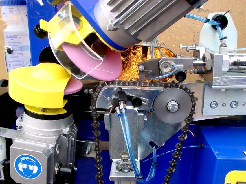 Такие станки оснащены специальными функциями для заточки под под определённым углом. Благодаря станку появляется гарантия, что диск к цепи будет подведён с максимальной точностью и аккуратностью. Также существуют станки со специальными тисками для зажатия цепи. Этот способ максимально подходит для новичков, поскольку удобство и безопасность гарантированы. Стоимость такого станка напрямую зависит от его функциональности.