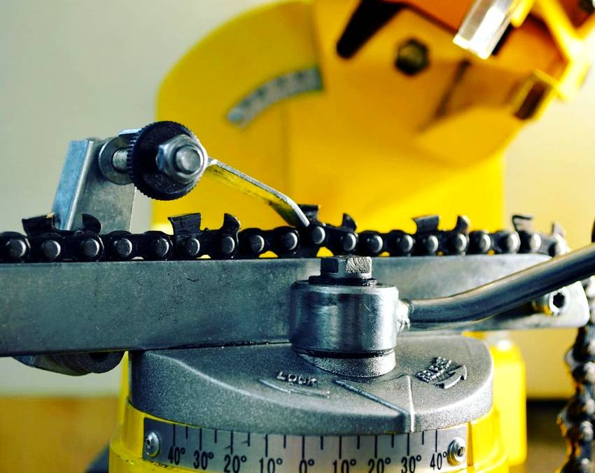 Принцип работы этого устройства таков: цепь закрепляют в зажимных тисках на опоре, а затачивающий диск в порядке очередности подводится к зубьям. Каждый зуб обрабатывается отдельно, но происходит это довольно быстро.