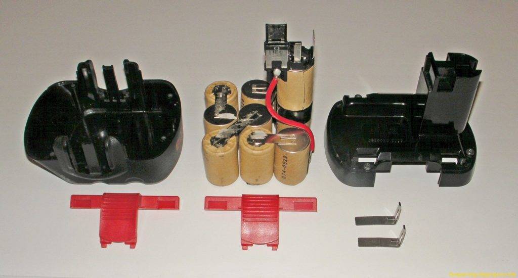 Для разборки аккумулятора шуруповерта вам необходимо раскрутить болты, соединяющие корпус, или разделить соединения корпуса на клеевой основе при помощи паяльника. Внутри аккумулятора находится несколько никель-кадмиевых батарей, имеющих определенную емкость и несущих заряд. В случае ремонта аккумулятора требуется их замена на новые.