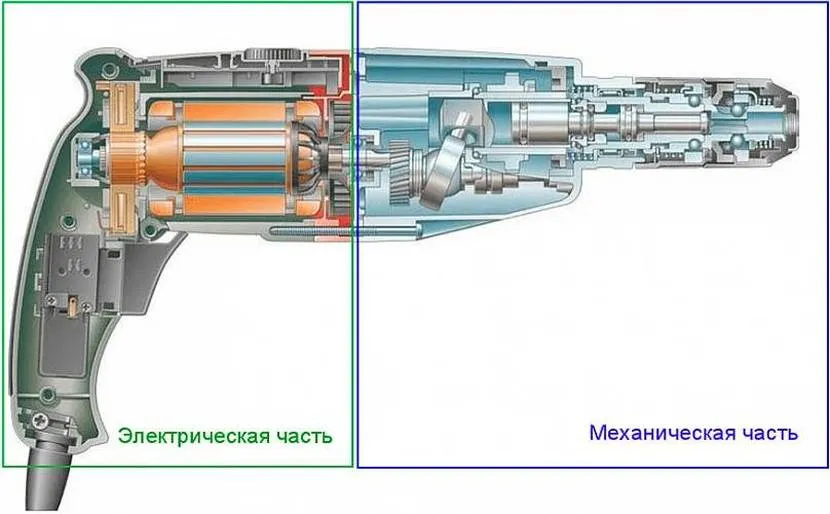 Условно механизм инструмента представлен механической, электрической частями и корпусом, где они объединяются, взаимодействуют. Дополнительно он защищает узлы от отрицательного влияния внешней среды.