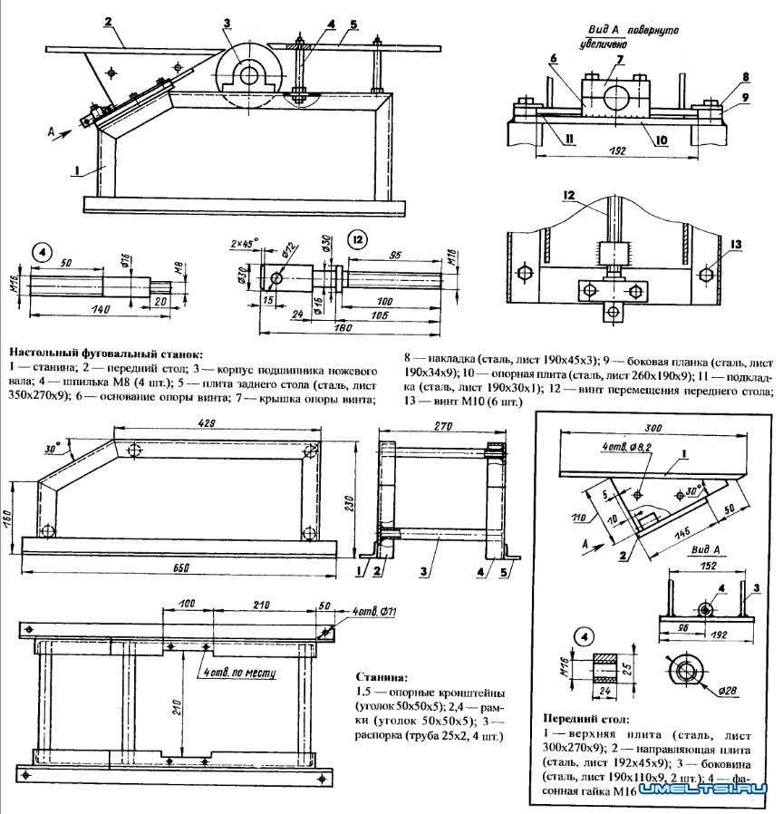 На рисунке представлены чертежи с подробными пояснениями. Потребуется электрический двигатель на 1,5 кВт, подключаемый к валу при помощи приводного ремня. Ножевой вал можно сделать самостоятельно или заказать у токаря.