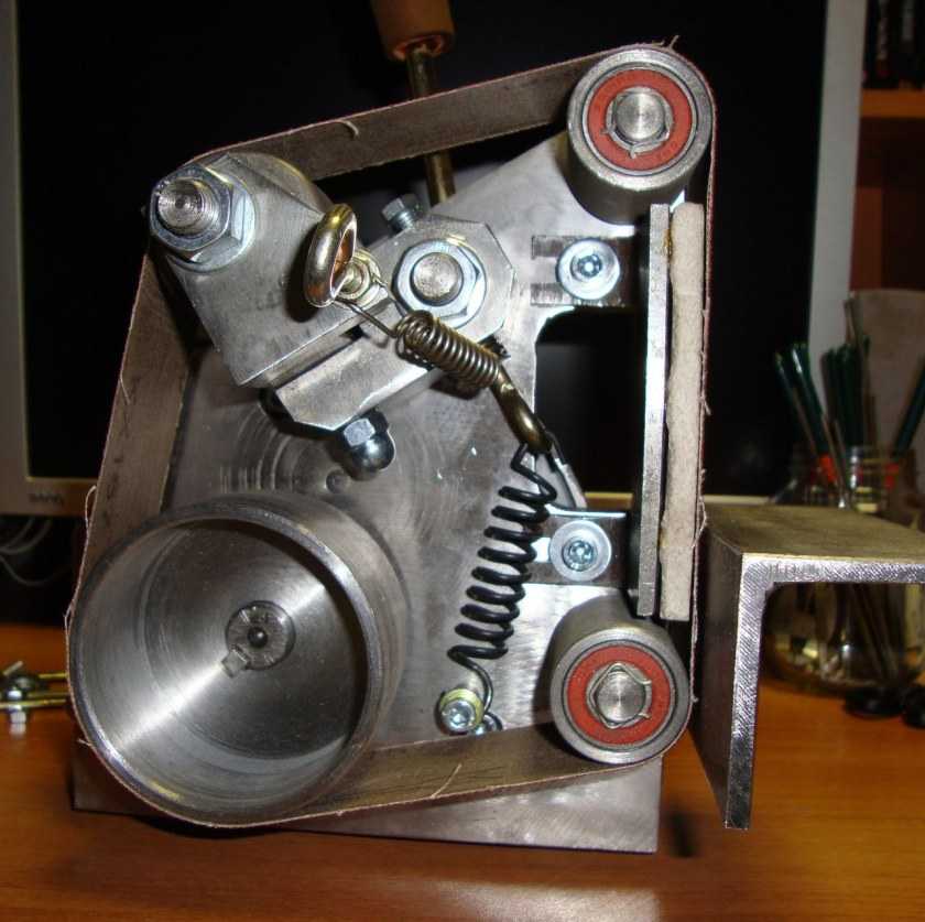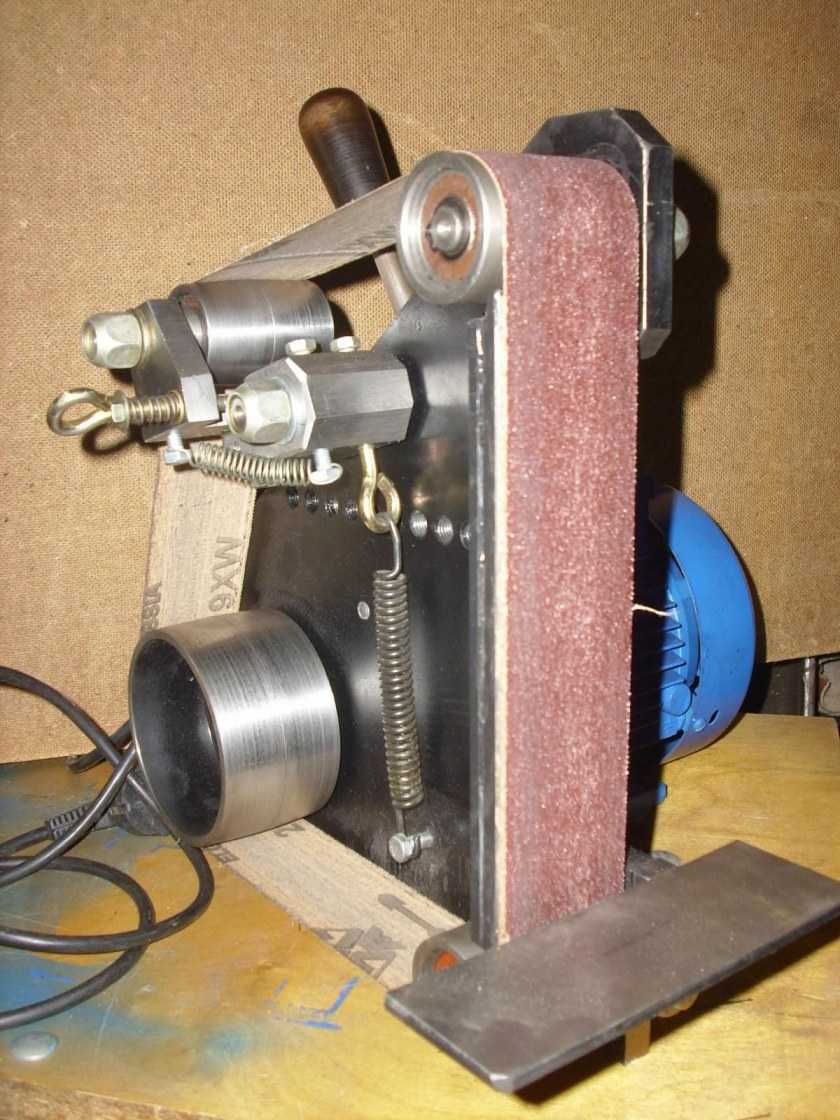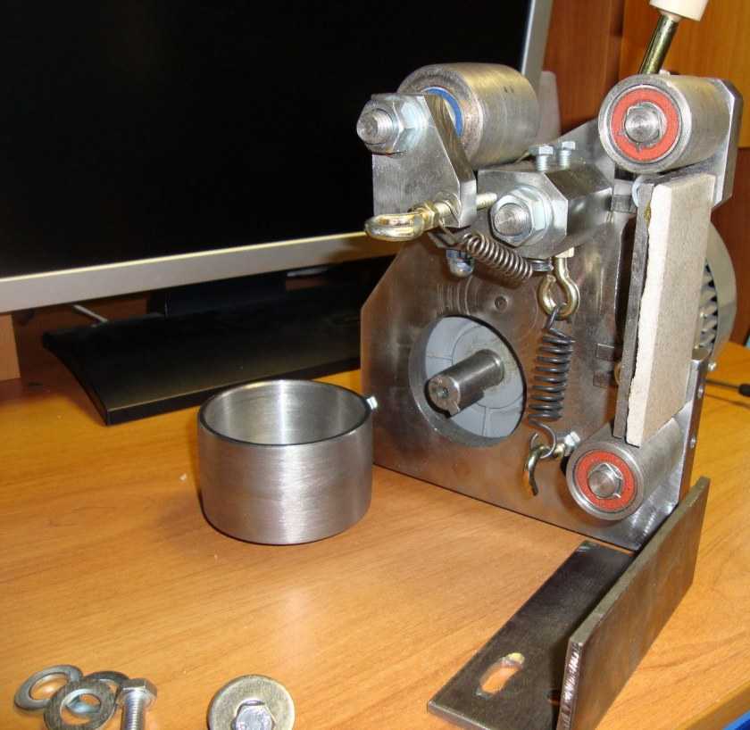У ленточного гриндера всегда можно увидеть пружину, которая необходима для того, чтобы обеспечивать автоматическое натяжение ленты-наждака. Если использовать такую пружину, то менять ленту будет очень удобно, а ее натяжение будет регулироваться автоматически. Следует сразу сказать, что менять ленту даже при обработке одного изделия необходимо будет несколько раз. Обработку любой металлической детали необходимо начинать с лентой с более крупным абразивом, постепенно меняя ее на более мелкую.