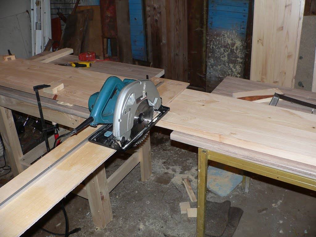 Из ручной циркулярки на деревянном опорном столе