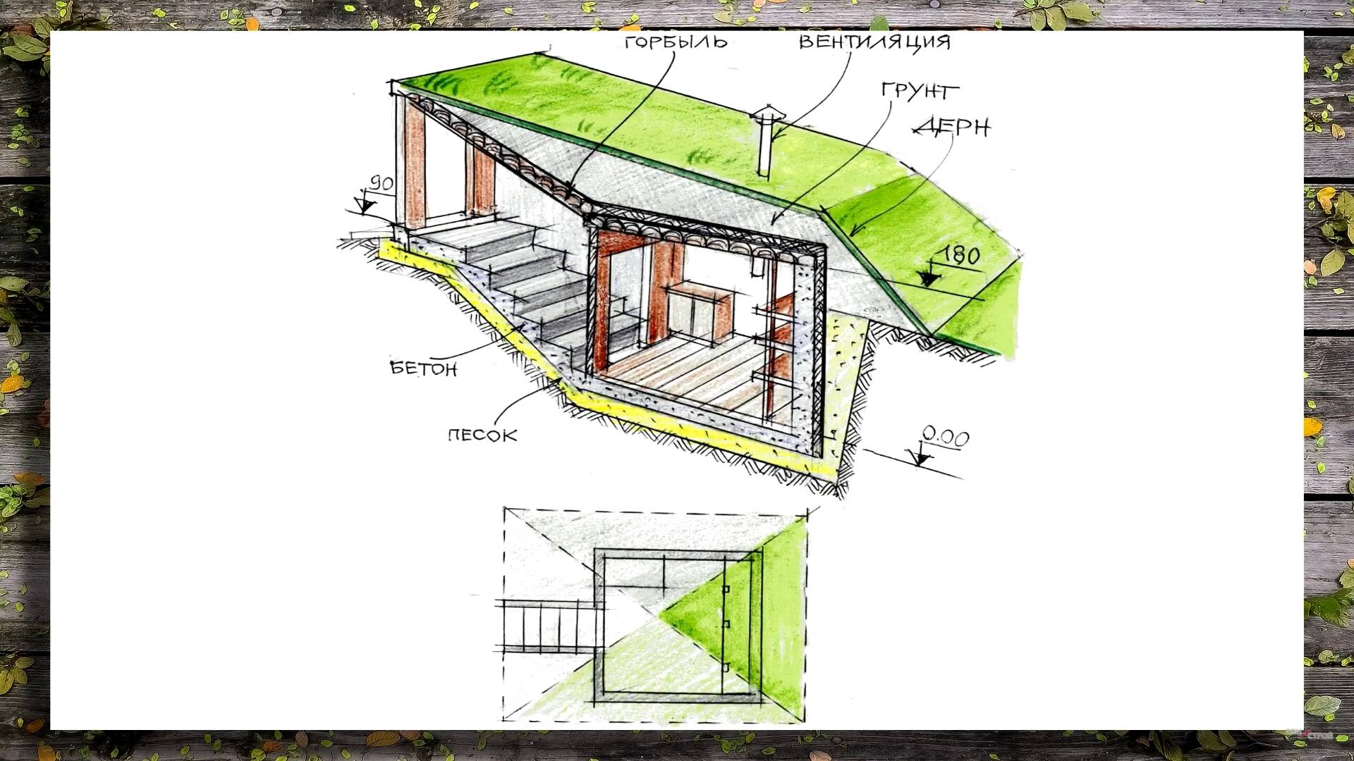 Построить простейшую конструкцию хранилища своими руками по силам каждому дачнику, используя доступные материалы. Первым делом стоит сделать небольшой чертёж с указанием всех размеров. Такой небольшой проект позволит определиться с количеством необходимых материалов, и земли на засыпку сооружения.