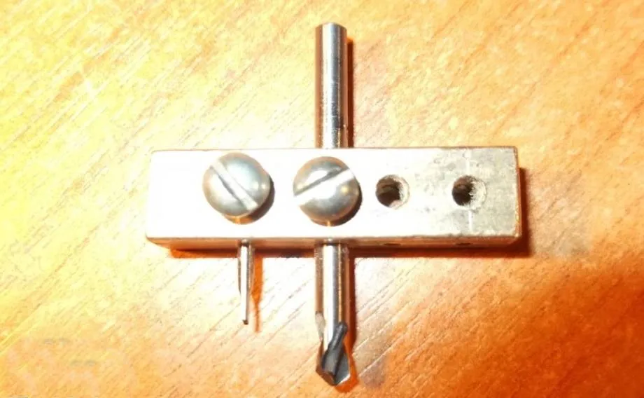В начале в металлическом бруске (по форме он должен напоминать продолговатый кирпич) просверлите отверстие под сверло и резец из кончика старого сверла небольшого размера.
