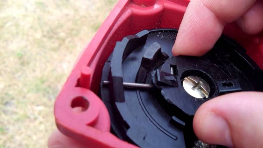 Чтобы заменить леску в триммере, снимите крышку головки. Для этого прижмите пальцами защелки фиксаторов, находящихся с обеих сторон крышки, и потяните крышку вверх. Откроется доступ к катушке. После этого вытащите ее, потянув вверх по оси, на которой катушка сидит. Если концы лески торчат из отверстий головки, то приподнимите катушку по оси и вытяните из отверстий головки остатки лески внутрь. Теперь деталь ничего не держит и ее легко снять и убрать оставшуюся рабочую нить.