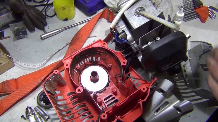 Стартер необходим для приведения триммера в рабочее состояние, его диагностика заключается в проверке натяжения шнура сцепленного с зубьями катушки стартера, которые часто разрушаются при резком запуске.