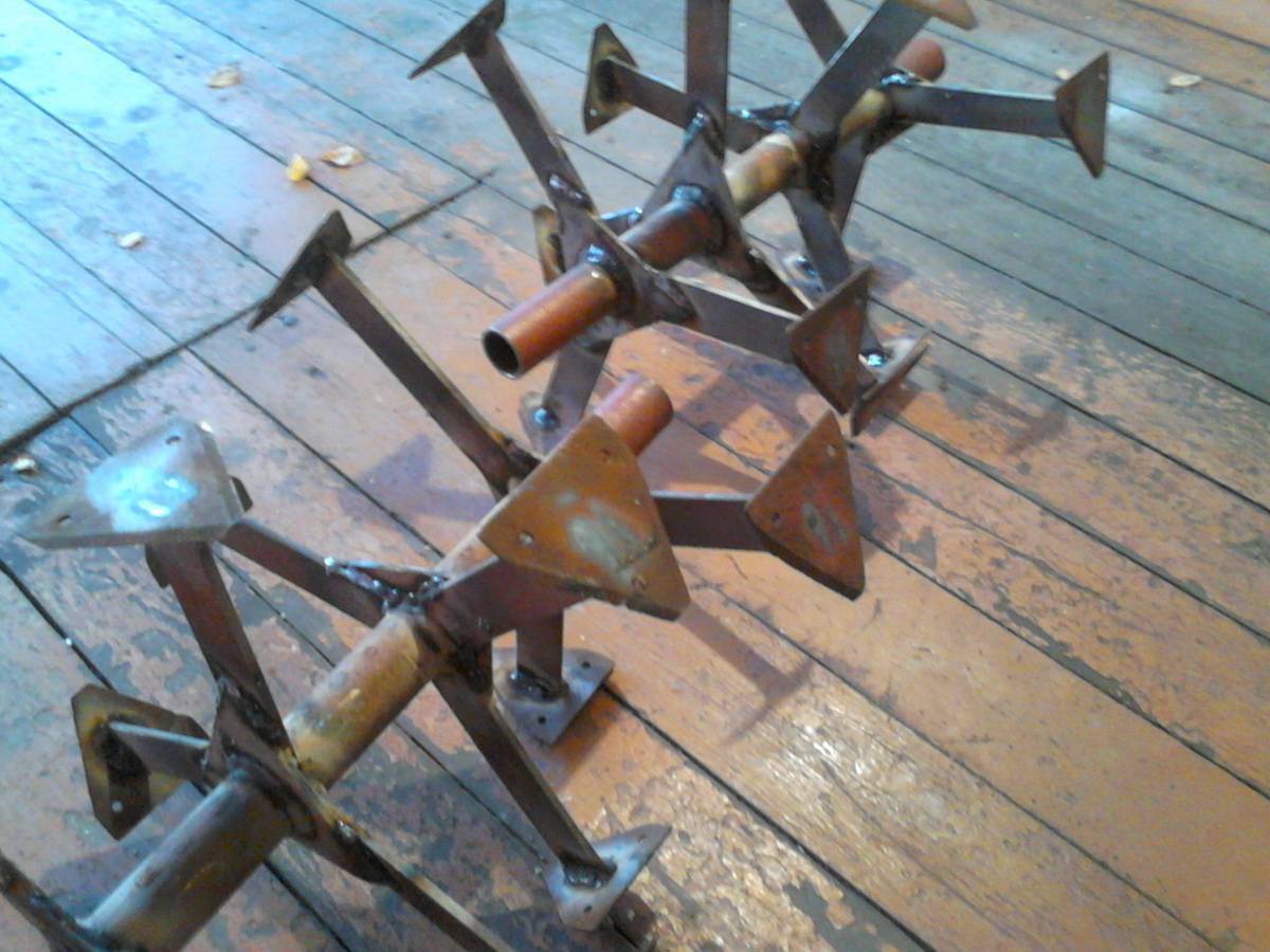 - Фланцы приваривают к валу, создавая правый и левый блоки. Их размещают на расстоянии в 10 см и под углом 45° по отношению друг к другу.