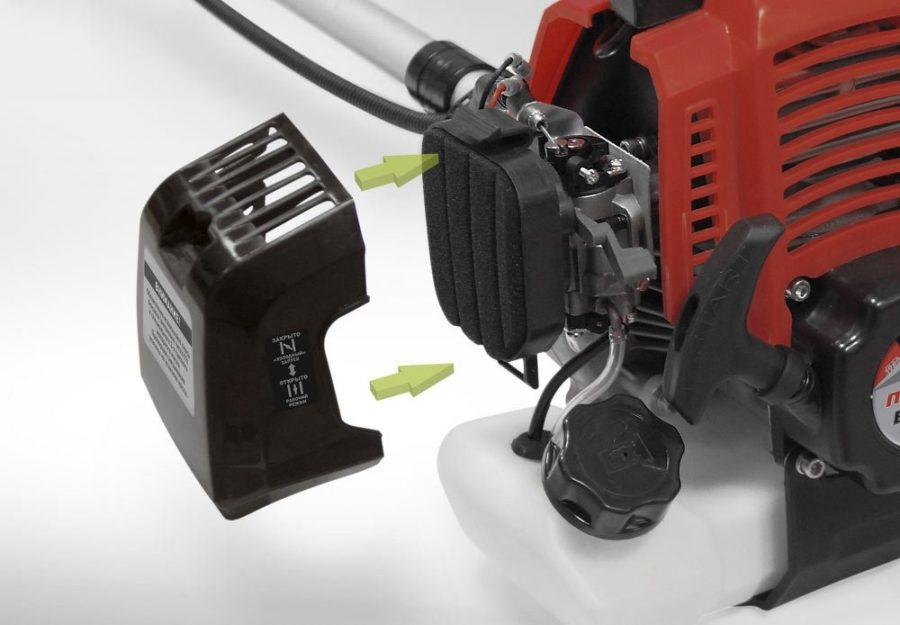 Для регулировки попадающего воздуха в устройстве садового инструмента предусмотрена дроссельная заслонка. Она играет достаточно важную роль, ведь от количества подаваемого воздуха зависит несколько факторов, главный из которых – мощность, развиваемая мотором триммера. Заслонка дросселя также необходима для безопасного запуска холодного ДВС.