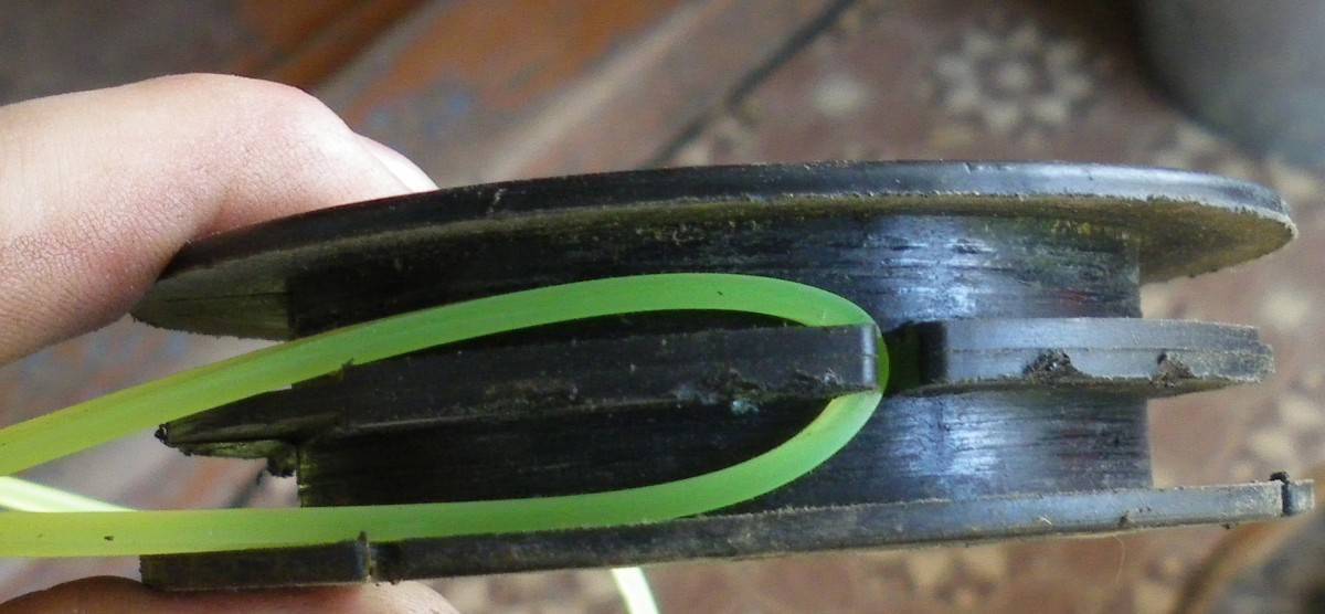 Кончики проделываются в отверстия корпуса шпули триммера. Их подтягивают до щелчка, который обозначает, что леска вышла из фиксаторов.