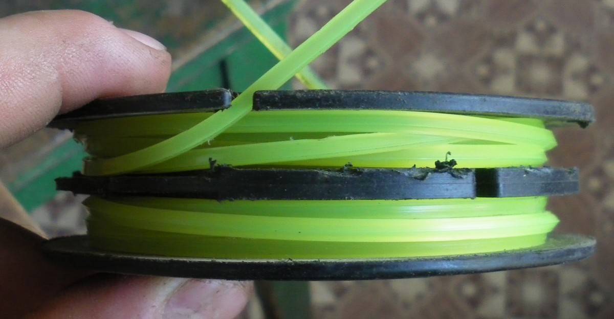 Во время кошения травы она может закончиться или оборваться. Поэтому понадобится замена корды. Вам понадобятся сама корда, перчатки (можно и без них, как комфортнее) и нож. Отмотайте из пачки необходимую величину и отрежьте. Можно кусок подержать полчаса в воде – он станет более гибким и прочным.