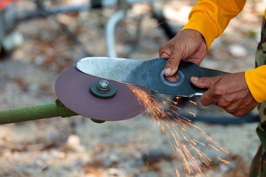 Для заточки обычно используется наждачная бумага. Если же вы располагаете приличным запасом времени, можно использовать напильник. Обязательно надевайте защитные очки при работе с острыми инструментами, а также толстые перчатки. Режущий элемент затачивается с каждой стороны под углом примерно в 30°.