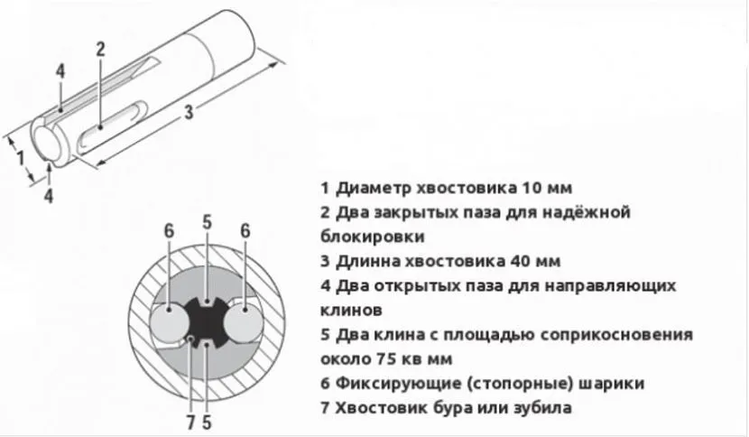 SDS-plus – наиболее востребованная группа. Диаметром всего 10 мм, углубляется в патрон на 4 см. Преимущество и отличие от родоначальника группы, хвостовика SDS кроется в двукратном превосходстве количества углублений. Здесь присутствует 2 закрытых и 2 открытых канала. Последние здесь работают в качестве направляющих, закрытые – играют роль стопора, предназначаются для фиксирующих подшипников. Величина площади, контактирующей с клиньями, всего 75 мм2.