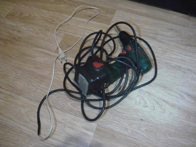 - Инструмент с внешним блоком питания. В этом случае делают отдельное устройство. Это не так страшно, потому что даже громоздкую конструкцию можно расположить в непосредственной близости от розетки. Однако с ограничением, связанным с длиной кабеля БП и сетевого шнура, придется смириться.