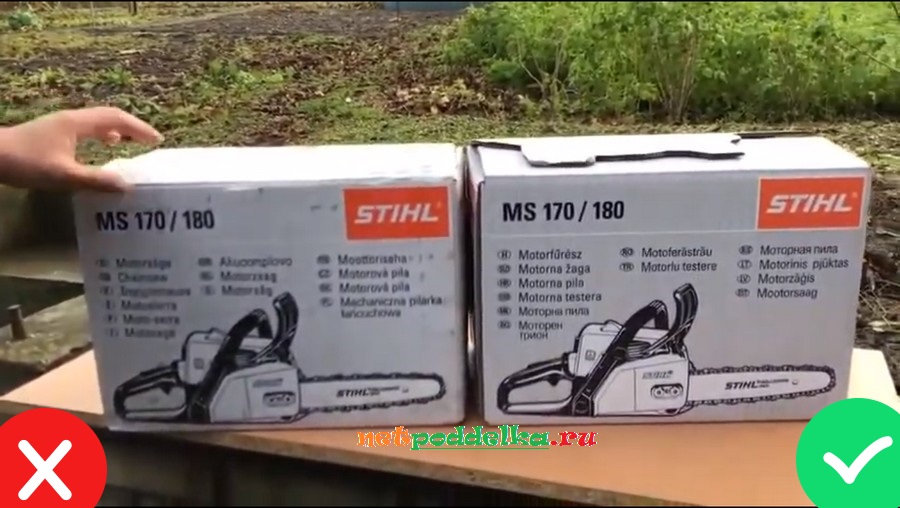 Современная техника позволяет мошенникам копировать оригинальную коробку для бензопилы Stihl. Однако размеры фирменной упаковки на пару сантиметров больше, чем у подделки. Кроме того, на коробке с оригинальной бензопилой «Штиль» в обязательном порядке размещается наклейка с указанием: