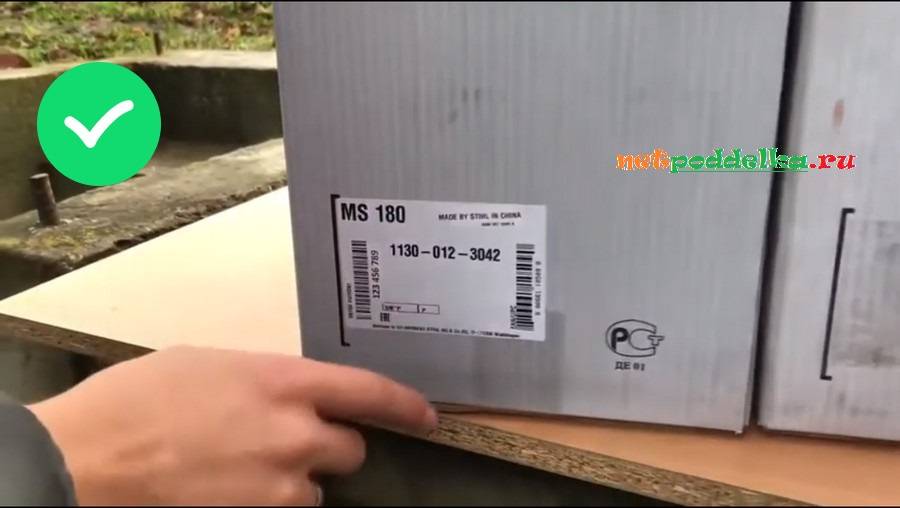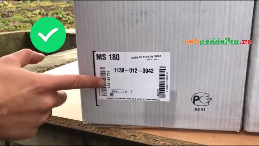 Заводской номер инструмента на упаковке должен совпадать с серийным номером на бензопиле. Он необходим для обращения в ремонт в фирменный сервисный центр. Каждая бензопила имеет свой уникальный серийный номер. Его отсутствие или дублирование на нескольких пилах ‒ признак, что бензопила Штиль МС подделка.