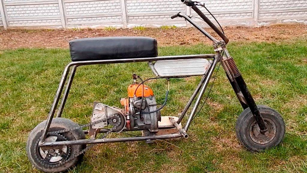 Во-первых, мы сперва разберем наиболее простой и доступный вариант того, как сделать мопед из бензопилы с фотографии выше. При сборке часто возникает вопрос, как поставить мотор от бензопилы на велосипед