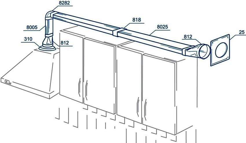 Разработка схемы. Чтобы правильно рассчитать необходимое количество элементов воздухоотвода, необходимо составить схему установки вентиляционного канала. Разнообразие элементов пластиковой конструкции позволяет выполнить практически любую вариацию короба. Чтобы вытяжка работала в нормальном режиме, нужно выполнить следующие условия: