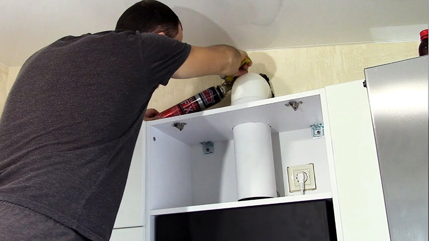 Конструкция второго уровня поможет не только спрятать рукав, но и надежно закрепить его на участке между вентиляцией и вытяжкой.