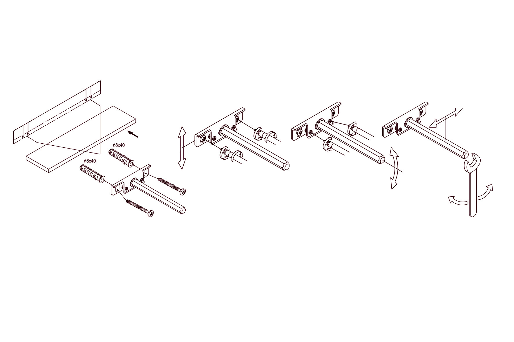 Этот способ предусматривает наличие в полке отверстий, в которые и будут вставляться металлические стержни мебельной фурнитуры, при этом стержень должен быть короче самого изделия на 2-5 см.