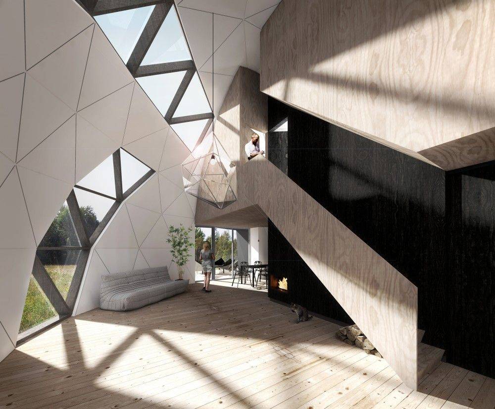 Интерьер купольного дома с тремя спальнями, одна из которых на втором этаже