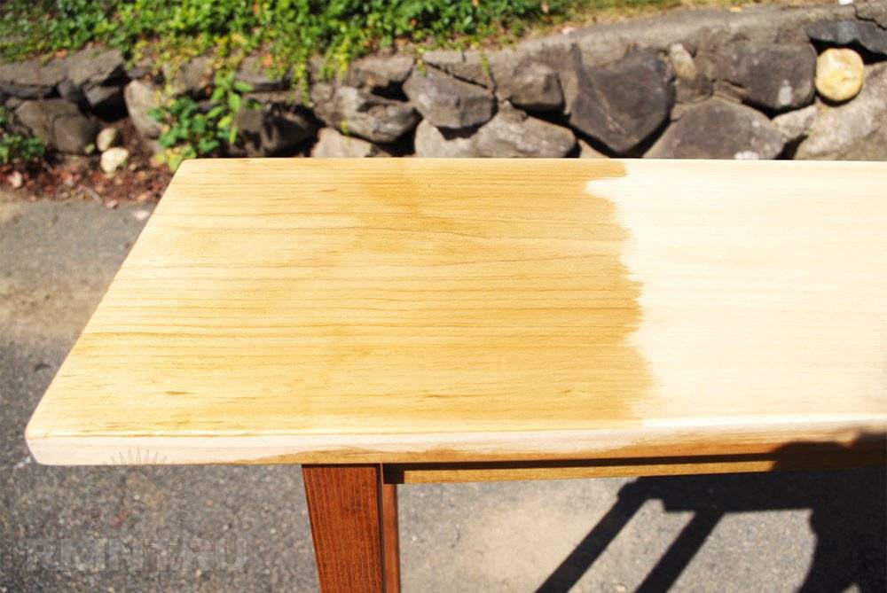 Масло должно наноситься не слишком обильно, но и не слишком тонким слоем. Найти золотую середину — это ключевой момент, иначе идеального качества вскрытия не добиться. Суть здесь примерно в том, что пока на внешнем слое масла схватывается плёнка, внутри состав ограничивается от контакта с кислородом и продолжает интенсивно впитываться. Однако способность к впитыванию разнится не только у отдельных пород, но даже на разных участках обрабатываемой детали. Чтобы в итоге масло легло равномерно, следует удалять излишки до того, как они окончательно полимеризуются.