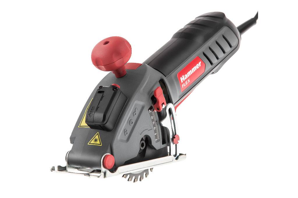 Продолжает наш рейтинг мини пила с диском Hammer CRP 500. Это недорогой, но эффективный инструмент для выполнения различных бытовых работ. Модель отличается качественной сборкой и эргономичностью. Мощность – 500 Вт, что хорошее решение для домашней мастерской. При этом глубина пропила доходит до 26 мм. Для ее настройки используется специальный регулировочный винт. Присутствует качественный лазерный указатель, который поможет работать точнее. Пользователю не придется даже размечать заготовку. Если планируется долгая работа, пальцы могут устать удерживать клавишу пуска. Эта проблема решается, так как оборудование поддерживает фиксацию кнопки запуска. Для проведения безопасной замены оснастки, используется кнопка блокировки шпинделя.