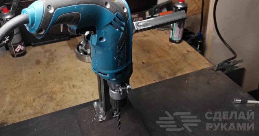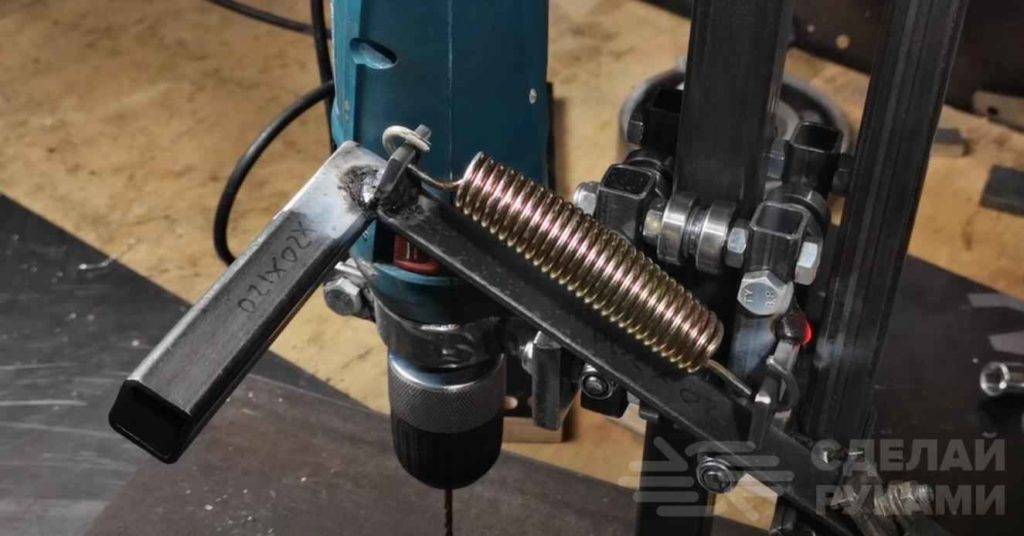В завершении останется только изготовить крепление для дрели. Крепим его к каретке. Устанавливаем электродрель. Для автоматического возврата каретки в исходное положение используется пружина.