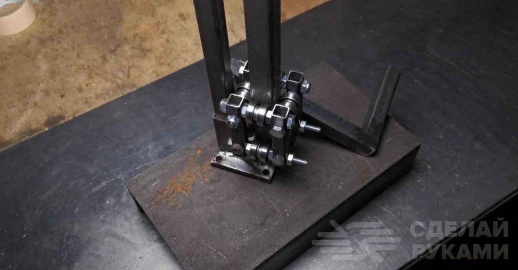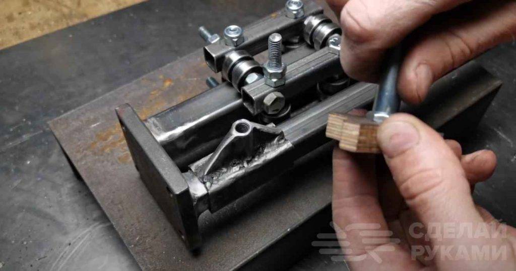 Из отрезков уголка и полосы необходимо изготовить подвижный элемент конструкции, который будет опускаться и подниматься вдоль стойки. По сути, эта деталь представляет собой каретку с механическим механизмом подачи.