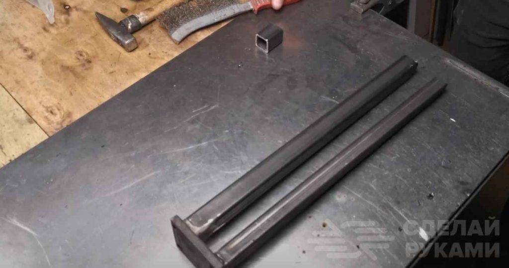 Первым делом изготавливаем стойку. Потребуется кусок толстого металла (пластина) и два отрезка профтрубы (20х20 мм и 25х25 мм). Длина каждой заготовки — по 40 см.