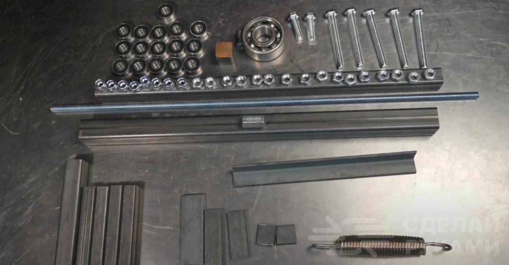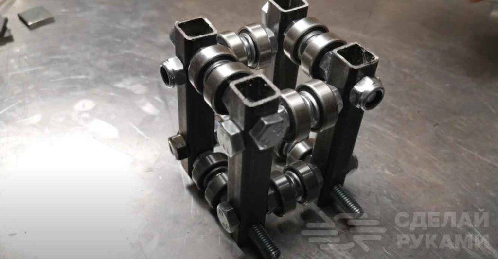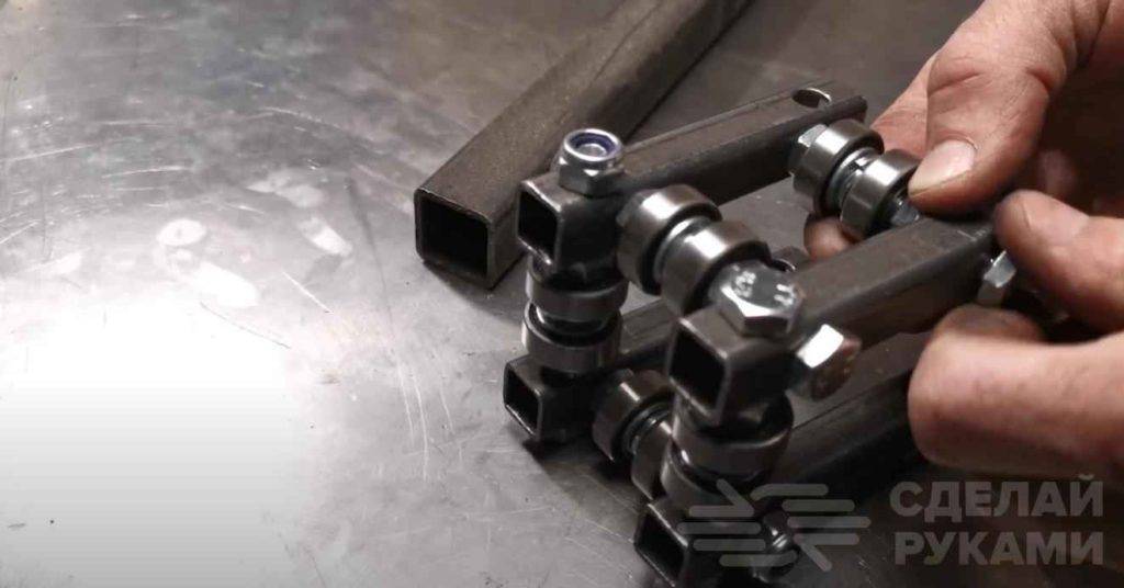 Из четырех кусочков квадратной профтрубы 15х15 мм, а также болтов с гайками и подшипников изготавливаем каретку.