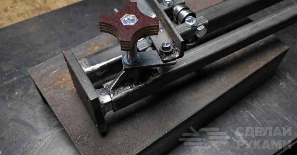 Далее к ползуну и каретке крепится рычаг из стального уголка. К рычагу нужно приварить ручку из профильной трубы.