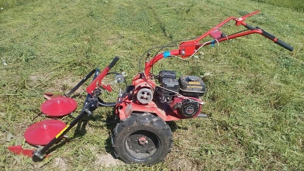 - Косилка роторная – выполняет покос и укладку травы в специальные валики. Устанавливается спереди мотоблока и используется для покоса травы и грубо-стебельной растительности. По отзывам владельцев, справляется и со скашиванием одиночного мелкого кустарника; зерновых культур. Многие люди отмечают, что после роторной косилки не нужно собирать траву граблями: она укладывается в равномерный рядок. Камней и муравейников данное оборудование не боится.