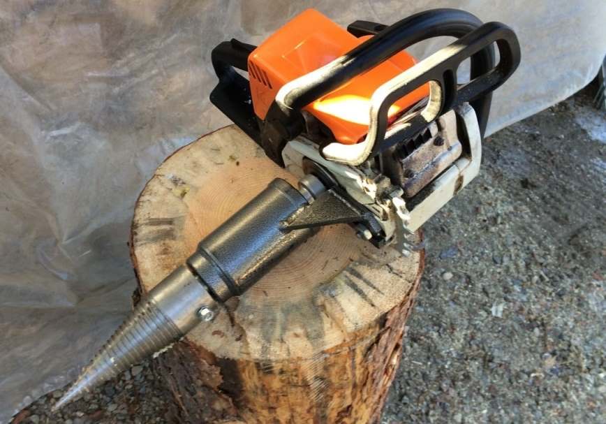 Кроме тех приставок, которые были описаны подробно в материале, к бензопиле можно подсоединить дровокол, чтобы раскалывать отпиленные пеньки. Дровокол имеет цилиндрическую форму с заострением, что дает возможность входить насадке внутрь древесины, и по достижению определенного углубления, происходит раскалывание пенька. Такая насадка исключает необходимость работать топором.