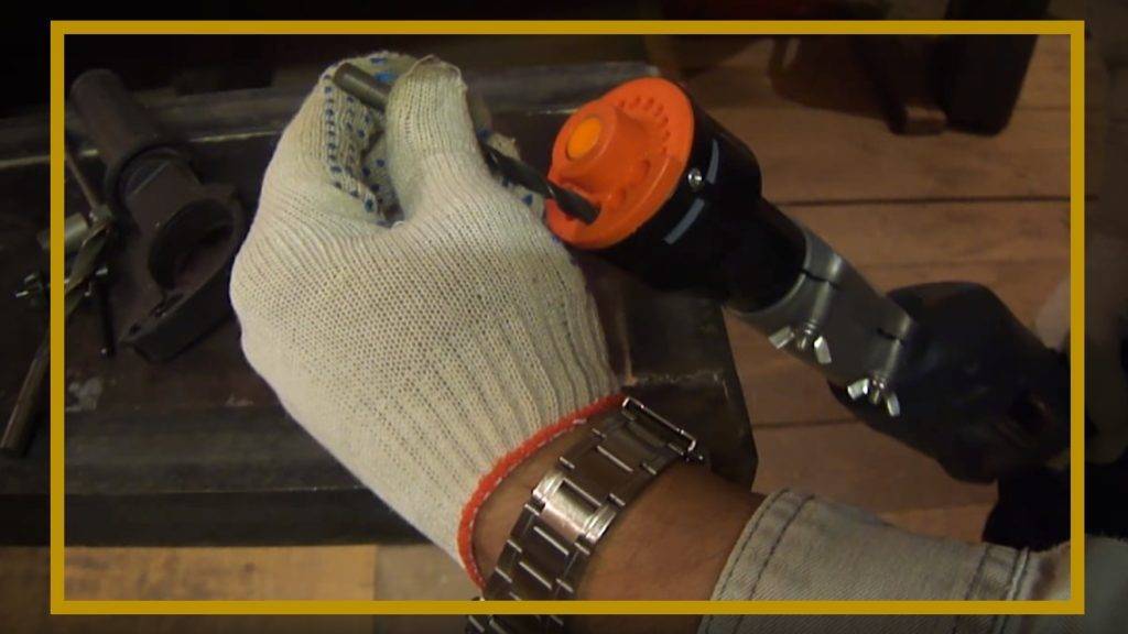 - Трудности в применении. Чтобы воспользоваться насадкой, необходимо закреплять дрель в неподвижном состоянии, что позволит обеспечить удобство применения устройства. При этом одной рукой потребуется нажимать на кнопку «Пуск» на дрели, а второй придерживать затачиваемую деталь.