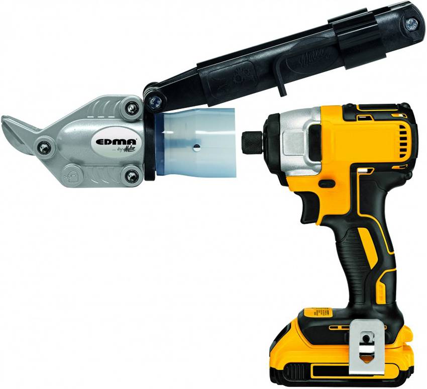 В процессе применения насадки «Ножницы» на дрели вращение патрона на инструменте преобразуется в возвратно-поступательные движения. В результате этого специальная матрица выбивает в металле полоску и отделяет материал. Толщина этой линии составляет 3,1 мм. При подобном способе раскроя листов срез получается качественным и ровным. Насадка «Ножницы» позволяет полностью отказаться от доработки краев на металле или свести ее к минимуму.