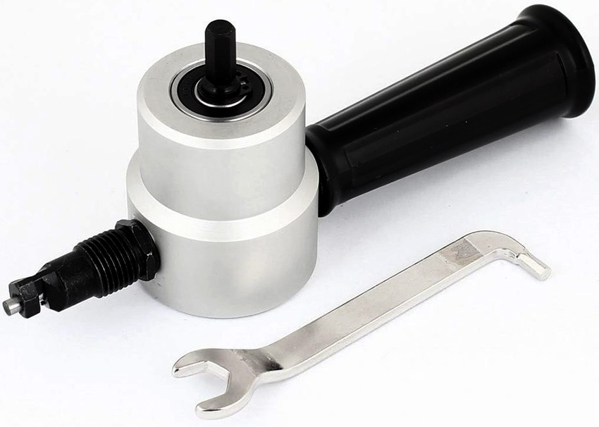 Есть очень удобная оснастка на дрель, называемая «Сверчком». Она представляет собой высечные ножницы, имеющие две режущие головки. Такое приспособление применяется для того, чтобы нарезать тонкий листовой металл: