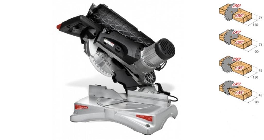 Пила отлично справляется с проведением угловых, наклонных и косых пропилов, сохраняя при этом высокую точность и чистоту резу. Смена пильного диска производится без использования дополнительных инструментов, механизм протяжки позволяет работать с длинномерными заготовками.