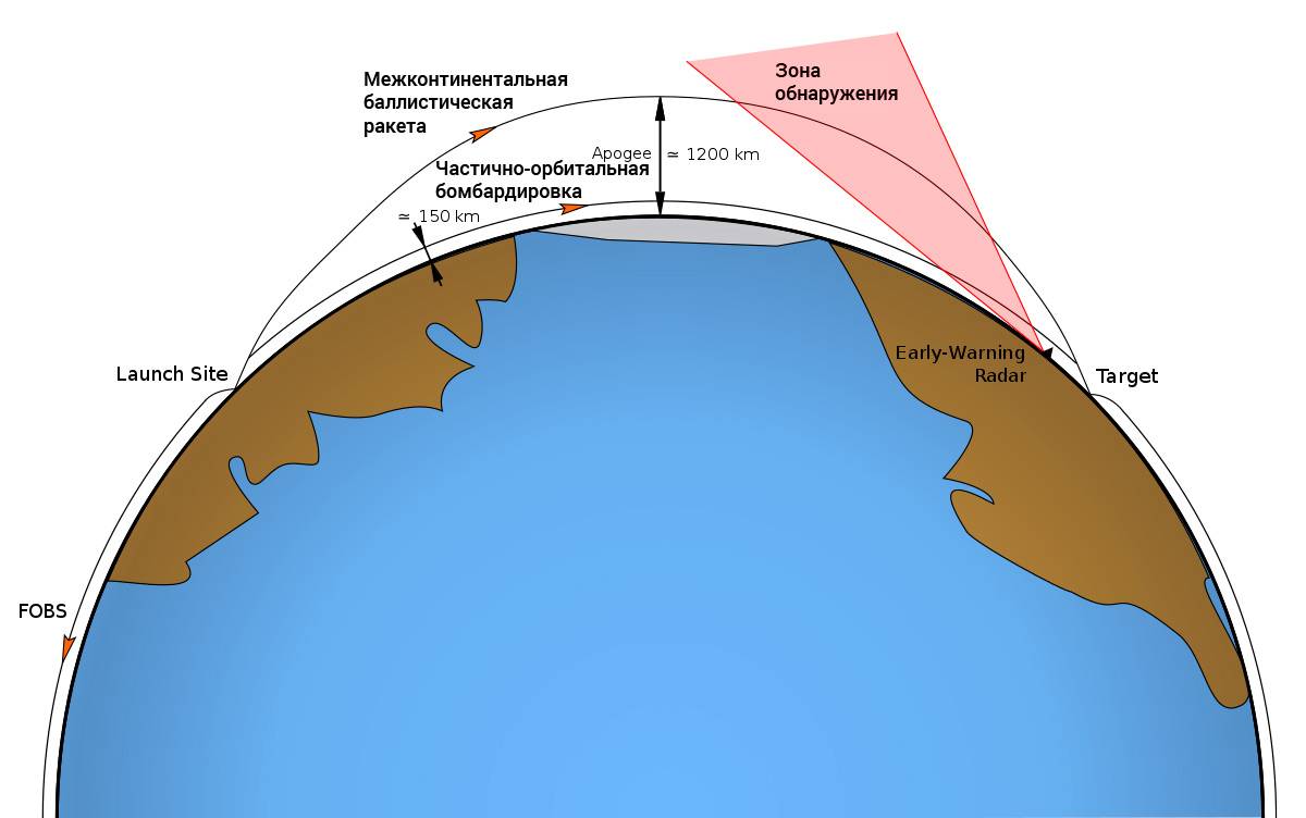Принцип действия «обычной» межконтинентальной баллистической ракеты и частично-орбитальной бомбардировки. Как видно из схемы, за счет меньшей высоты полета, засечь удар FOBS с поверхности планеты гораздо сложнее. Напомню – речь шла о 1970-х, когда ни одна страна не могла похвастаться обширной сетью космических станций для слежения и разведки