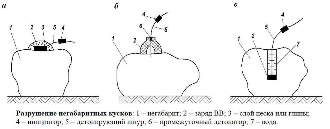 Наиболее часто используемым способом является проведение вторичных взрывных работ. Различают взрывной способ с применением накладных и шпуровых зарядов. Последний используется крайне редко.