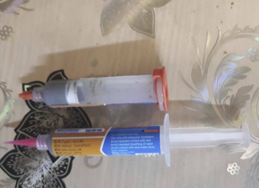 Для пайки BGA микросхем удобно использовать специальную пасту, содержащую припой вместе с флюсом. Вот эта паста поставляется в тюбиках по 10 см3. Довольно удобная упаковка, в тюбике. Пасту легко нанести на плату. Делать это нужно аккуратно, слишком много наносить не следует.