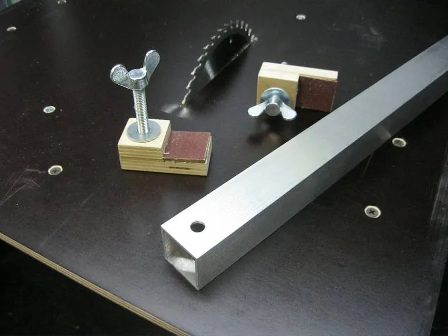 - Приступим к производству вспомогательных упоров. Для упора потребуется алюминиевая труба квадратного разреза № 30 и 2 винта с гайками-барашками. Отпиливаем кусочек трубы по протяжённости столешницы, в 3 см от края делаем отверстия под винты. С кусочков фанеры выпиливаются 2 прижима. Система готова.