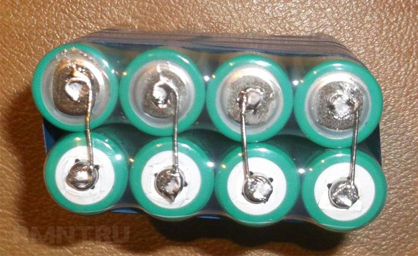 Если позволяет объем, можно параллельно соединить 2 последовательные сборки по 4 аккумулятора, увеличив емкость батареи вдвое. При этом, взаимное расположение может быть каким угодно – по форме корпуса. Главное – обеспечить надежное соединение проводов.