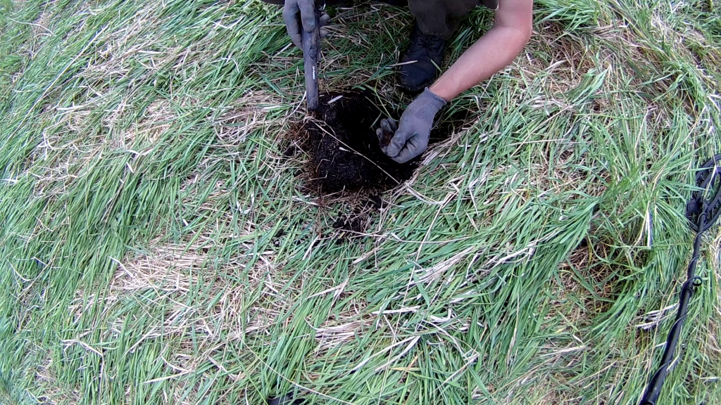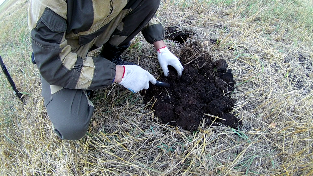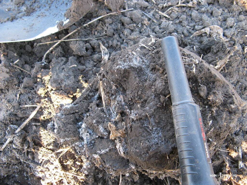 Здесь можно было бы привести не один десяток фото, т.к. SHRXY GP-Pointer — мой постоянный помощник в поисках, и количество выходов без него можно пересчитать по пальцам одной руки. Поэтому добавлю фото одного из первых копов в деревне. Если мелкие металлические предметы в вынутом из ямки грунте мне с моим зрением обнаружить без пина просто нереально, то в случае металлом покрупнее, особенно залегающим глубоко, пинпойнтер помогает локализовать центр цели — и это позволяет меньше копать впустую.