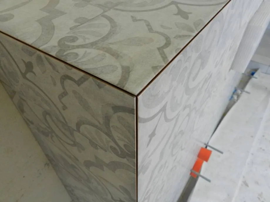 • Угол становится более уязвим при ударах. Особенно, если находится на проходе. Достаточно, зацепить откос пустым металлическим ведром, чтобы кусочек сточенного угла на плитке, отлетел. • Возрастает трудоемкость работ, а значить и цена.