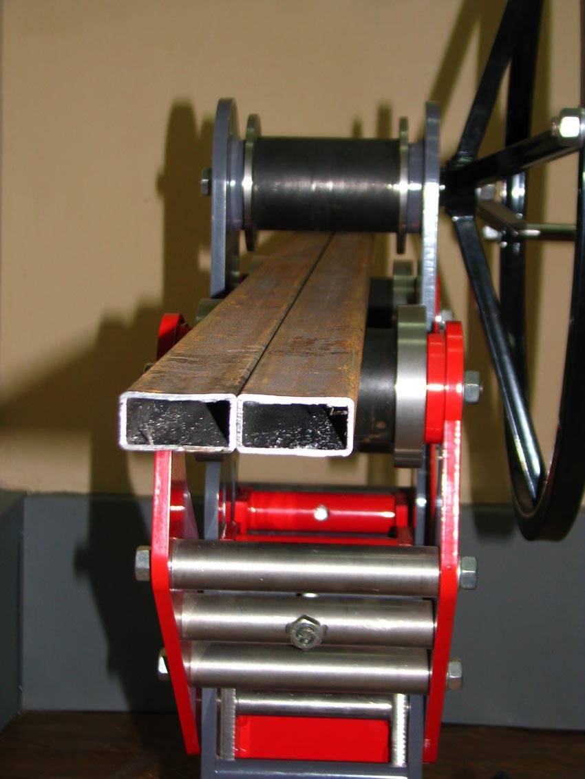Высоту подъема изменяют домкратом, поднимая край стола. Ручка для протягивания металлоизделия крепится к центральному неподвижному ролику.