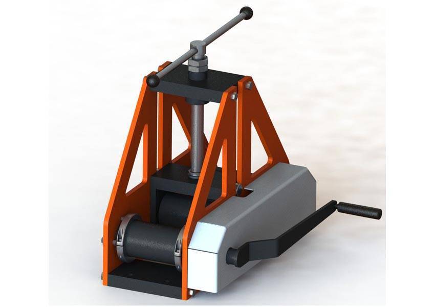 Конструкция ручного трубогиба с ведущим центральным валом состоит из основания, двух опорных роликов и одного подвижного. Воздействие регулируют воротом прижимного винта, вставленным в верхнюю часть механизма.
