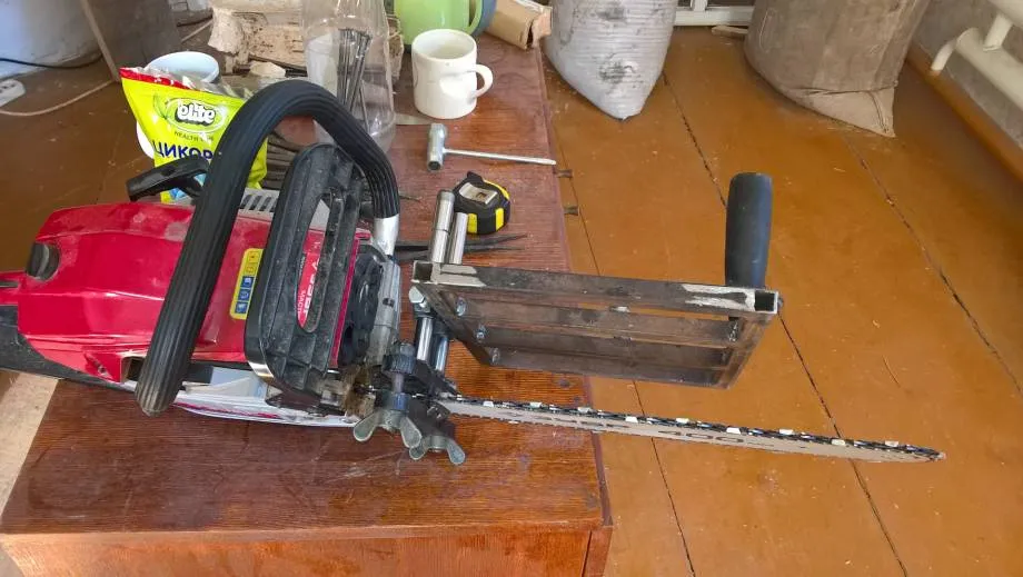 При необходимости заготовку можно распилить бензопилой на доски пользуясь специальными насадками. Рамка для бензопилы крепится на инструмент и предназначена для обеспечения прямолинейного движения при горизонтальном распиле заготовки. Конструкция состоит из: