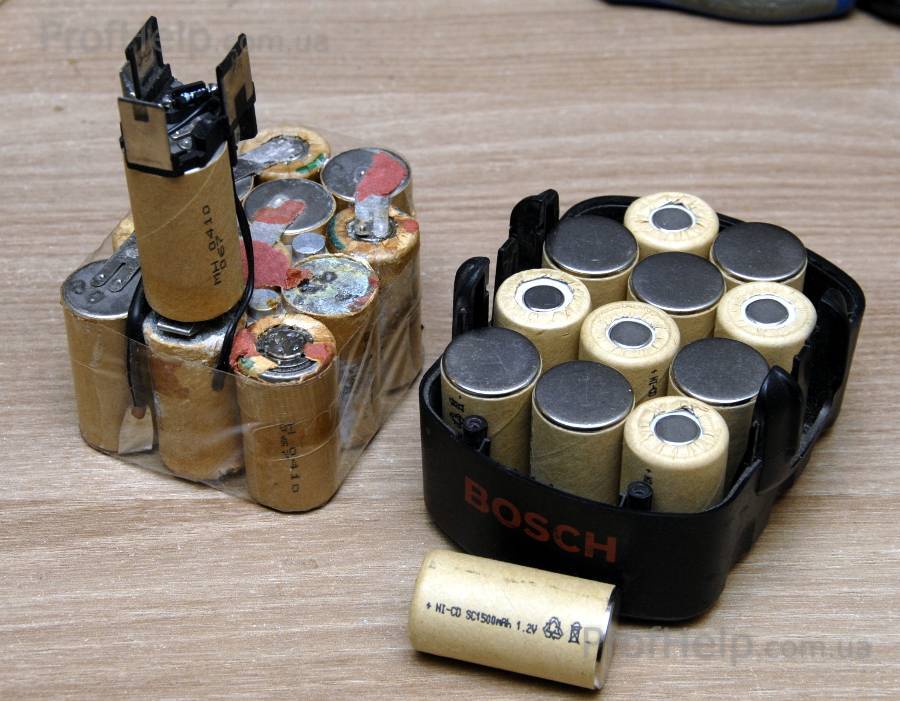 Неработоспособность Ni-Cd или Ni-MH батарей часто связана с потерей емкости одного или нескольких элементов. Ремонт аккумулятора шуруповерта своими руками по силам большинству домашних умельцев. Для того, чтобы определить неисправный элемент, замеряют напряжение на каждом из них (к выходным клеммам батареи при этом подсоединяют достаточно мощную нагрузку, например, автомобильную лампочку). Напряжение на нерабочем элементе будет около нуля. Забракованные таким способом аккумуляторы заменяют исправными, соблюдая полярность подключения. При пайке соединений следует избегать перегрева корпуса банок.